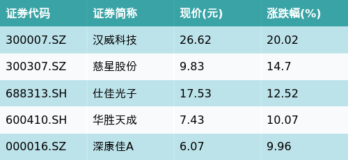 截至午间收盘,芯片概念主题涨跌幅最高的五只股票为:汉威科技(300007.SZ)、慈星股份(300307.SZ)、仕佳光子(688313.SH)、华胜天成(600410.SH)与深康佳A(000016.SZ)。详情见下表: